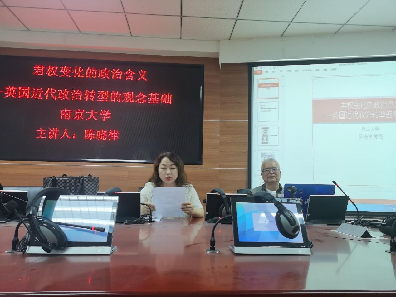党总支书记冯璐璐教授进行了总结发言,冯璐璐教授表示,陈教授本次讲座的意义在于弥补了我们在世界历史方面的欠缺。反观英国的君主制,中东国家也有许多君主制国家, 诸如海湾国家、约旦、摩洛哥等,陈教授的研究对理解中东的君主制有很大的启发意义和方法论的指导意义。她代表与会师生对陈晓律教授的精彩讲座表示感谢。