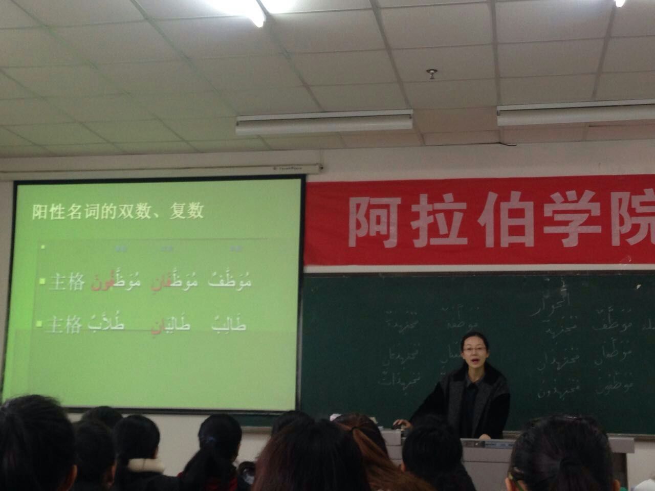 第一堂课由丁萍老师和王艳老师主讲,时间是上午第二小节课,地点在贺兰山校区1教d103教室,主讲课程是基础阿语Ⅱ。在课堂上,丁萍老师授课节奏紧凑,授课内容丰富,课堂整体感染力极好。王艳老师在授课过程中,师生积极互动,拓展了同学们的自主学习能力,一边讲授新的知识点一边复习旧知识点,授课方式特色明了。