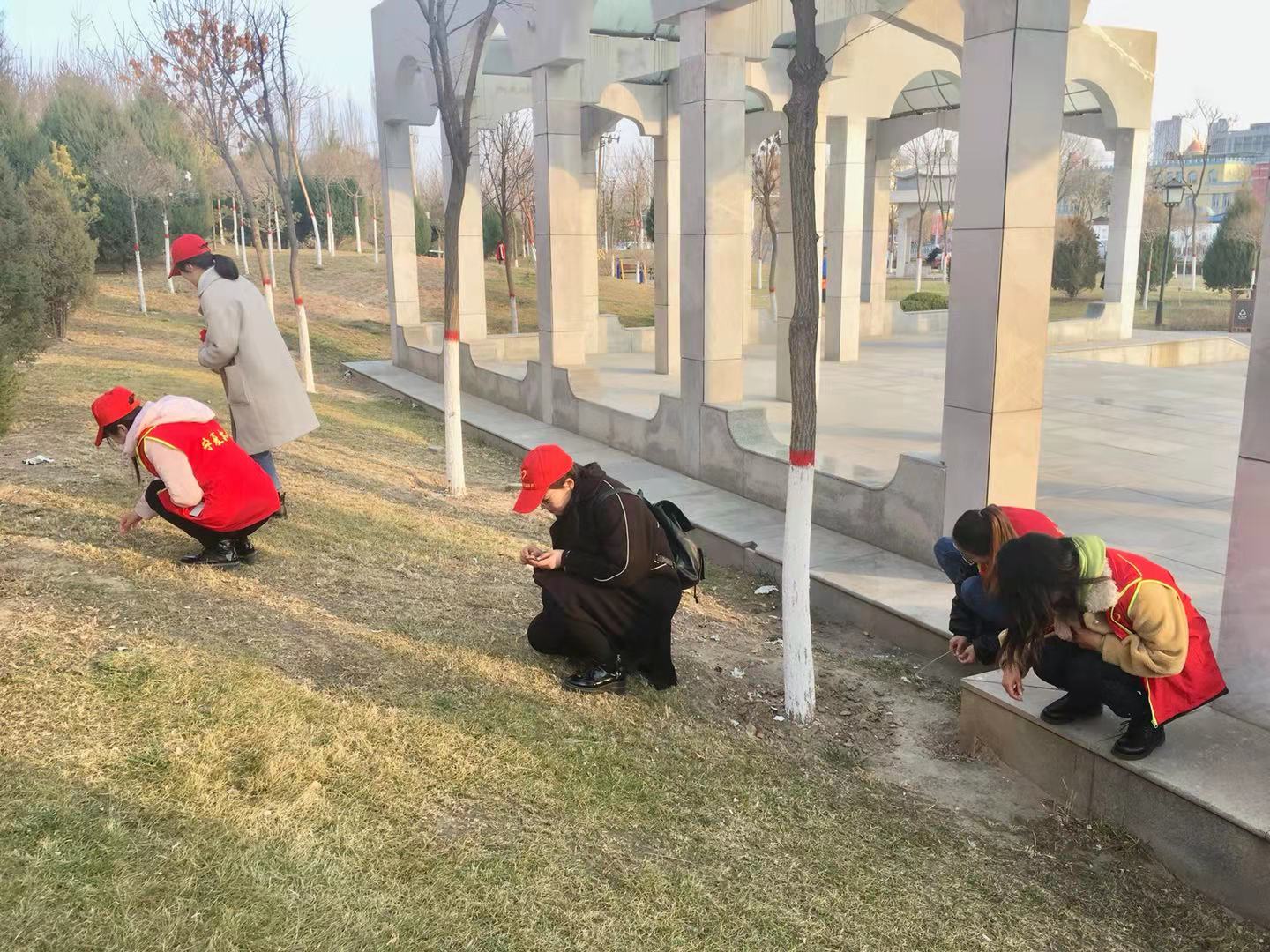 学生党支部组织学生党员在兴庆公园开展“不忘初心、牢记使命”主题教育之志愿服务清扫活动。