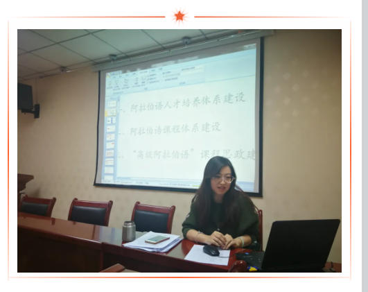 同时,白楠副院长从课程思政的实践教学、思政的挖掘与融入、教学方法及教学效果等分别进行了详细的经验教授,鼓励教师们积极申报并参与阿拉伯语课程思政的教学改革,尝试开展多种教学改革形式,在实现课堂部分翻转的基础上进一步拓展教学内容、优化教学结构,应该创新思路,努力打造阿拉伯语专业课程与思政同向同行。