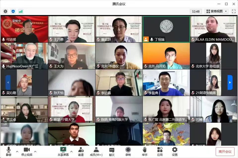 本次颁奖仪式由北京大学外国语学院副院长付志明教授主持,中国著名阿拉伯文书法家米广江先生,北京大学阿拉伯语系副主任廉超群长聘副教授,北京大学阿拉伯语系李海鹏、高山助理教授出席颁奖仪式。