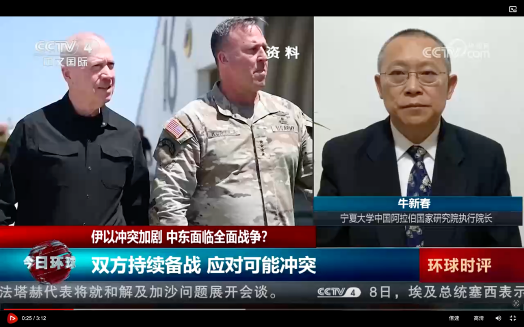 环球娱乐 学术副校长、中国阿拉伯国家研究院执行院长,中国中东学会副会长、中国人民外交学会理事牛新春教授接受了中央电视台等主流媒体的采访,就伊以、黎以冲突及趋势进行了分析和解读。