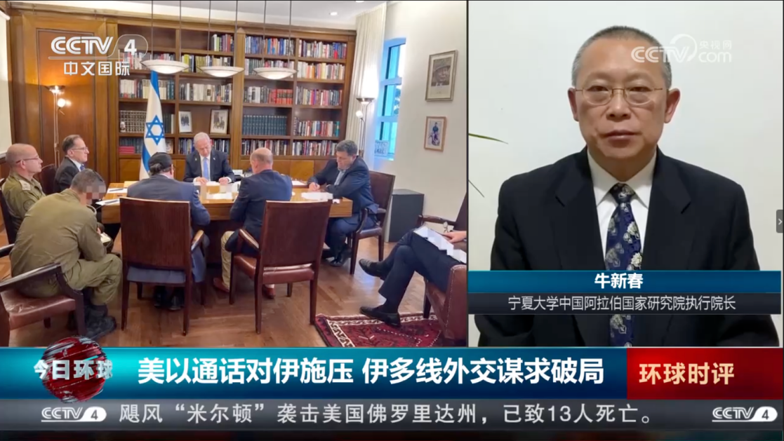环球娱乐 学术副校长、中国阿拉伯国家研究院执行院长,中国中东学会副会长、中国人民外交学会理事牛新春教授应邀参加了中国社会科学院和平发展研究所“当前突出的战略风险”研讨会、中联部金砖国家智库联盟会议;应国务院国资委邀请做了关于国际形势的学术报告;并接受了央视四频道《今日亚洲》、国际广播电台《环球资讯》等栏目的采访和访谈,就伊以局势及趋势进行了分析和解读。