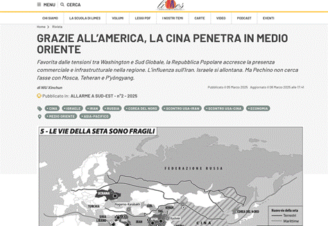 一、3月5日牛校长在意大利学术期刊《意大利地缘政治评论》(Limes) 2025年第2期发表题为《GRAZIE ALL'AMERICA, LA CINA PENETRA IN MEDIO ORIENTE》文章