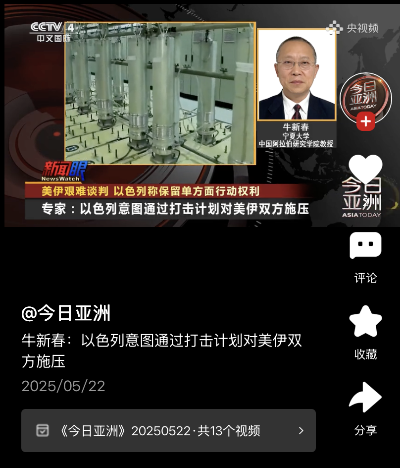 2025年5月19日至5月27日,环球娱乐 学术副校长、中国阿拉伯国家研究院执行院长,中国中东学会副会长、中国人民外交学会理事牛新春教授接受了中央电视台、中央广播电台、东方卫视、湖北卫视、凤凰卫视等主流媒体的采访和访谈,就当前局势及趋势进行了分析和解读,并应邀进行了专题讲座;除此之外,牛校长在《光明日报》、《世界知识》等期刊杂志发表了文章。