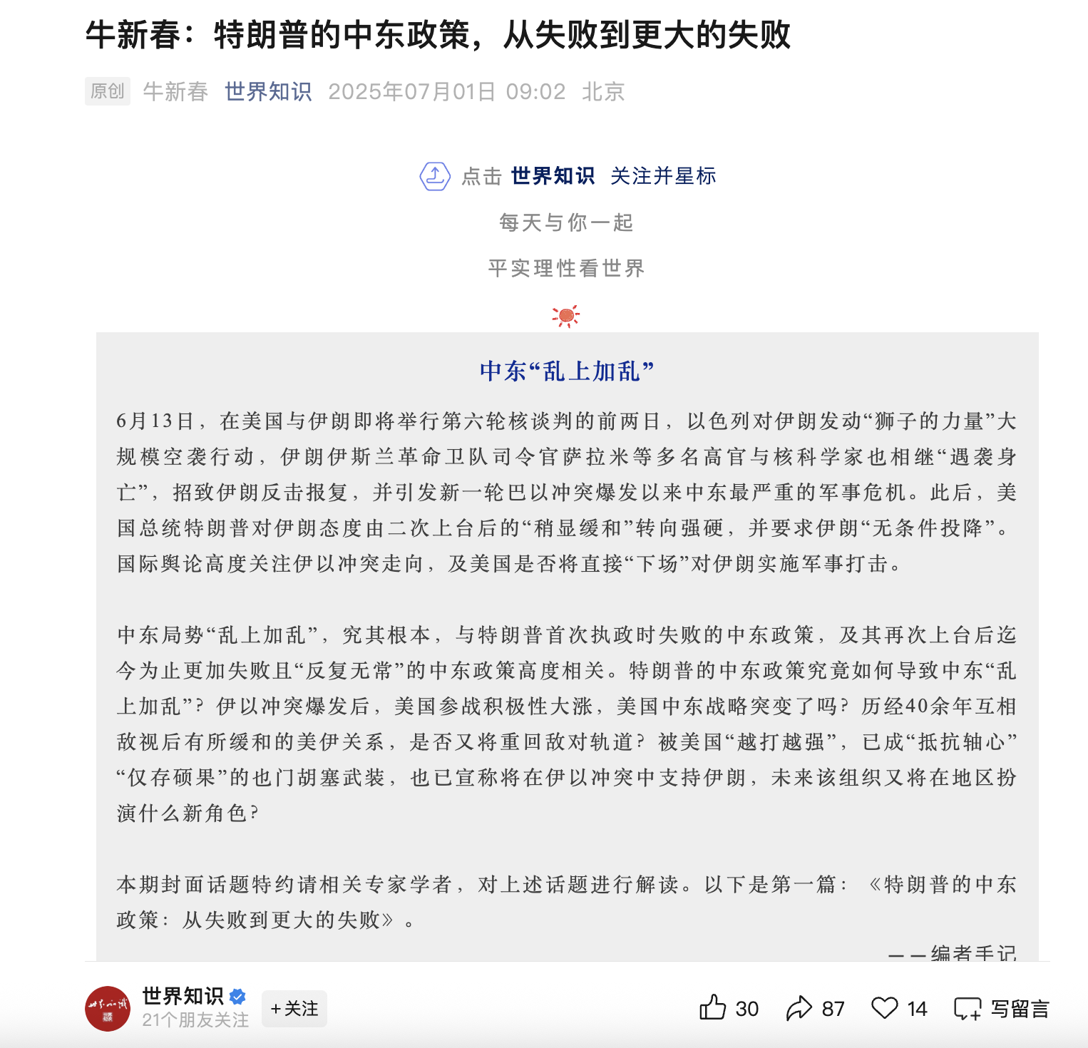 六、7月1日牛院长在“世界知识”杂志发表题为《特朗普的中东政策,从失败到更大的失败》文章