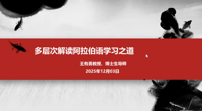 王有勇教授从语音、词汇、语法、语篇、翻译五个维度,系统阐释了阿拉伯语学习的路径与方法。在语音教学环节,他针对中国学生常见发音误区,提供了清晰的纠音指导并现场示范;在词汇解析部分,他深入讲解了阿拉伯语词根派生规律,帮助学生建立科学的词汇认知体系;在语法教学中,他将复杂规则归纳为若干核心原则;语篇与翻译方面,王教授结合真实语料,强调句子逻辑衔接与表达中的“形神兼备”,并指出翻译需掌握“取舍”的艺术。整场讲座内容翔实、贴近实际,为学生构建了清晰系统的学习框架,通过生动形象的语例和丰富精彩的音视频让师生们领略了阿拉伯语的音韵美、形式美和诗性美。