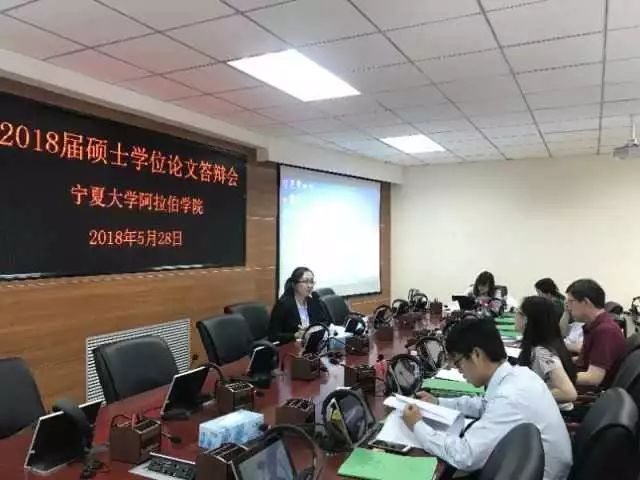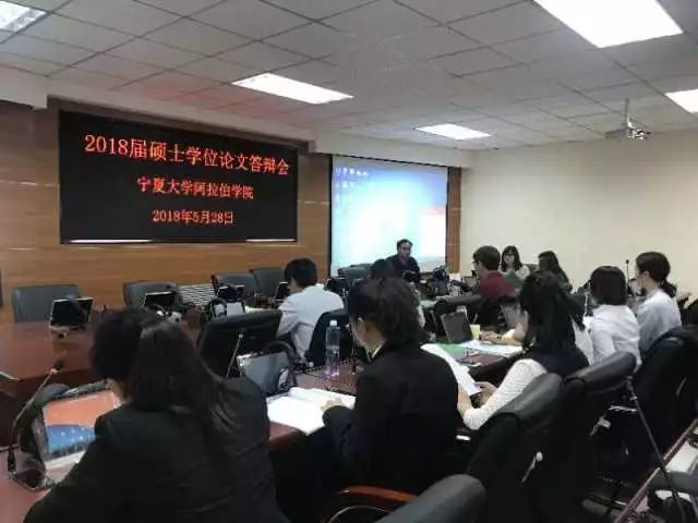 2018届研究生硕士学位毕业论文答辩在学院报告厅举行,特邀外国语学院周玉忠教授担任本次答辩委员会组长,委员会成员有中国阿拉伯国家研究院副院长冯璐璐、学院副院长白楠、马占明教授和刘东宁博士,全体研究生导师和研究生共同参加了此次答辩。答辩由学院常务副院长金忠杰教授主持。